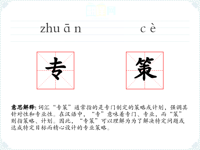 在英语中,“专策”可以对应为“special strategy”或“specific plan”。在不同文化中,虽然表达方式不同,但都强调了针对性和专业性。