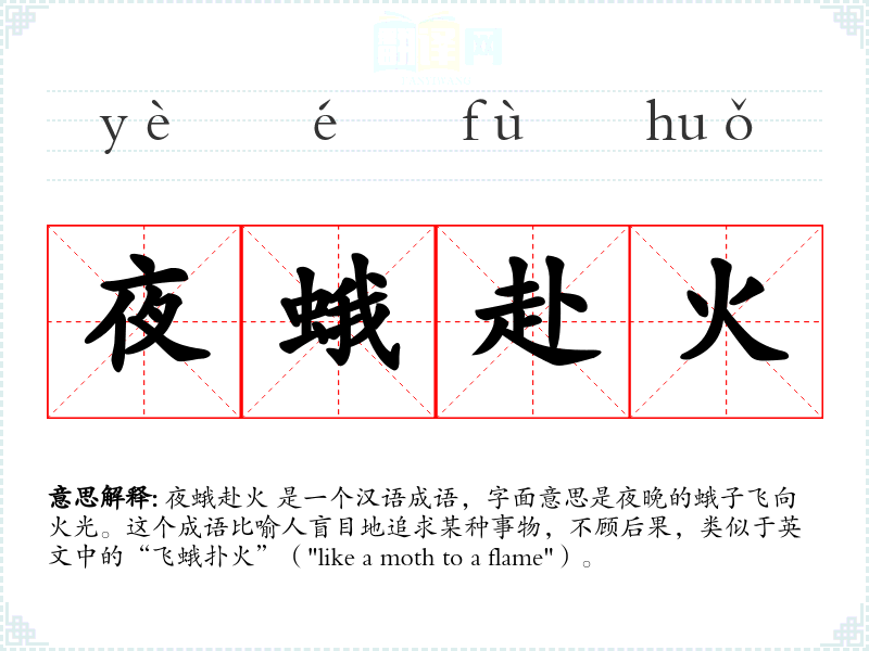 夜蛾赴火 这个成语深刻地揭示了盲目追求的危险性,提醒我们在生活中要保持理性和审慎。在语言学*和表达中,理解和正确使用这个成语可以帮助我们更准确地传达复杂的情感和警示。