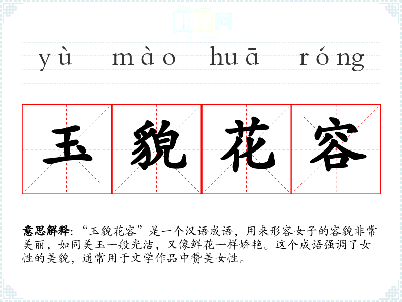 “玉貌花容”是一个汉语成语,用来形容女子的容貌非常美丽,如同美玉一般光洁,又像鲜花一样娇艳。这个成语强调了女性的美貌,通常用于文学作品中赞美女性。