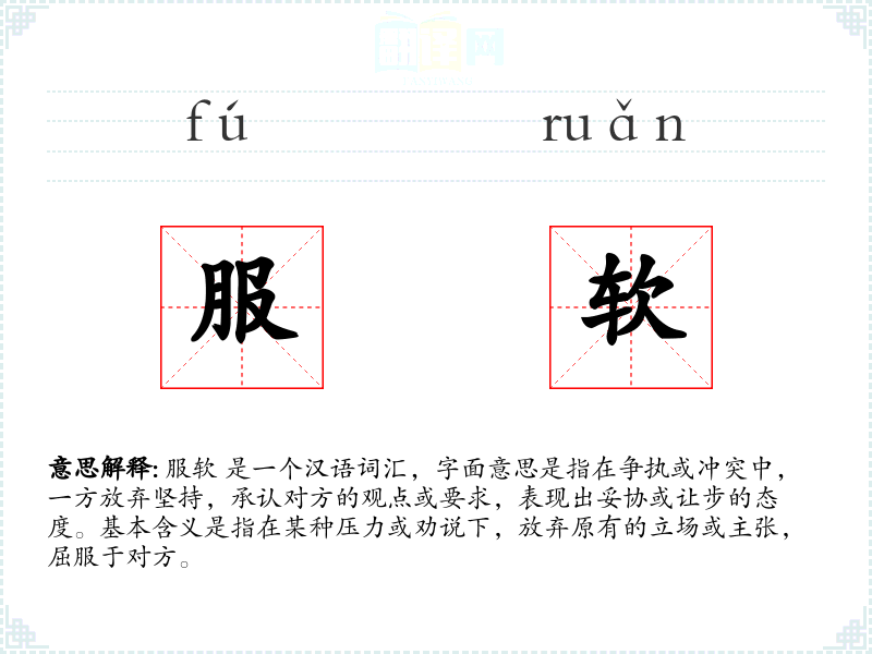 这些同义词和反义词在语义上与“服软”有所重叠,但每个词都有其特定的语境和细微差别。例如,“让步”通常指在谈判或争论中做出的具体妥协,而“妥协”则可能包含更多的无奈和牺牲。