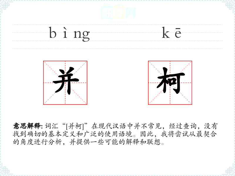 由于“[并柯]”不是一个标准的汉语词汇,我们无法提供一个确切的基本定义。它可能是某个特定领域或方言中的词汇,或者是拼写错误或打字错误。