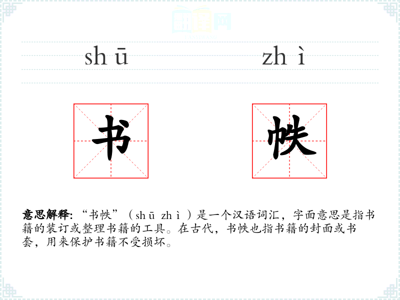 “书帙”(shū zhì)是一个汉语词汇,字面意思是指书籍的装订或整理书籍的工具。在古代,书帙也指书籍的封面或书套,用来保护书籍不受损坏。