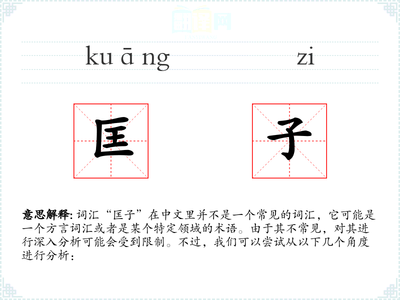 综上所述,由于“匡子”不是一个常见词汇,对其进行深入分析存在一定的困难。在语言学习中,我们应该注重掌握常见和常用的词汇,以便更好地进行交流和表达。
