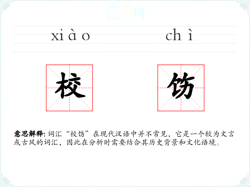 词汇“校饬”在现代汉语中并不常见,它是一个较为文言或古风的词汇,因此在分析时需要结合其历史背景和文化语境。