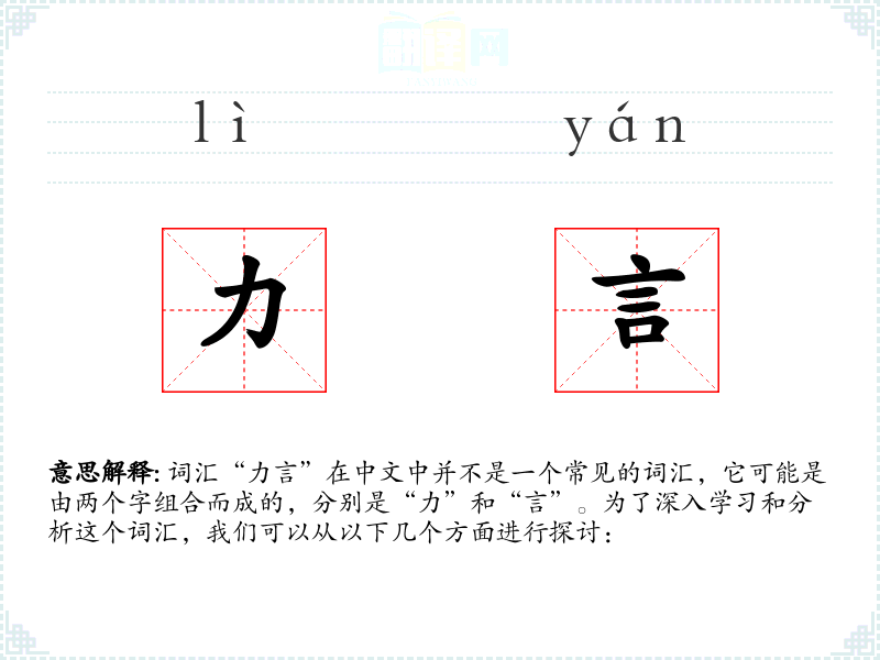 词汇“力言”在中文中并不是一个常见的词汇,它可能是由两个字组合而成的,分别是“力”和“言”。为了深入学*和分析这个词汇,我们可以从以下几个方面进行探讨:
