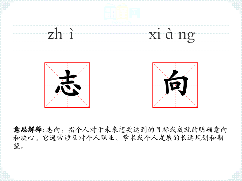 - 词源:志向一词源自汉语,由“志”和“向”两个字组成。“志”指意向、决心,“向”指方向、目标。