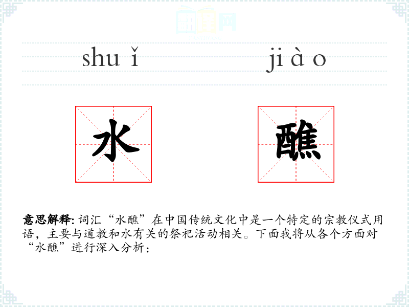 词汇“水醮”在传统文化中是一个特定的仪式用语,主要与道教和水有关的祭祀活动相关。下面我将从各个方面对“水醮”进行深入分析: