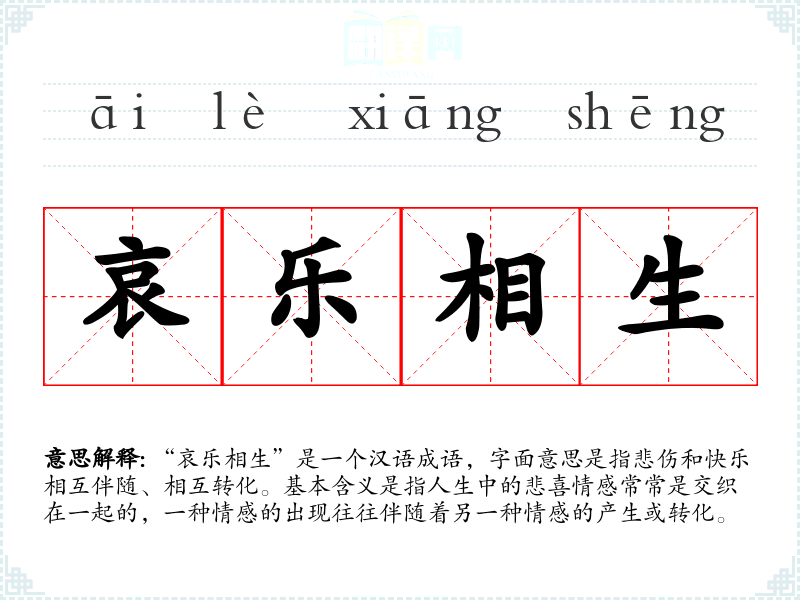 “哀乐相生”是一个汉语成语,字面意思是指悲伤和快乐相互伴随、相互转化。基本含义是指人生中的悲喜情感常常是交织在一起的,一种情感的出现往往伴随着另一种情感的产生或转化。