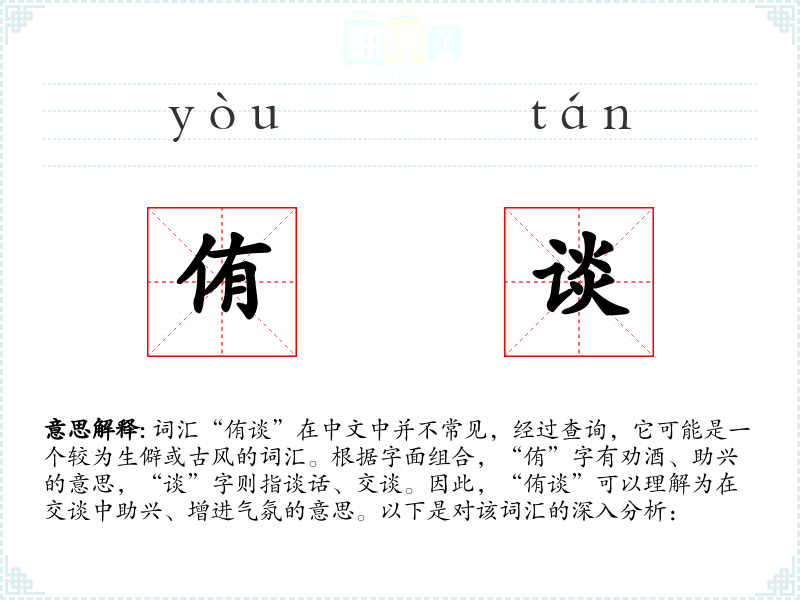 在古代**,文人雅集是一种常见的社交活动,交谈是其中重要的组成部分。在这样的背景下,“侑谈”可能被用来形容那些能够通过交谈来提升聚会氛围的人。