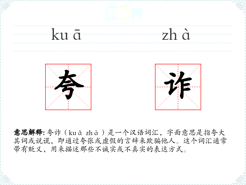 夸诈(kuā zhà)是一个汉语词汇,字面意思是指夸大其词或说谎,即通过夸张或虚假的言辞来欺骗他人。这个词汇通常带有贬义,用来描述那些不诚实或不真实的表达方式。