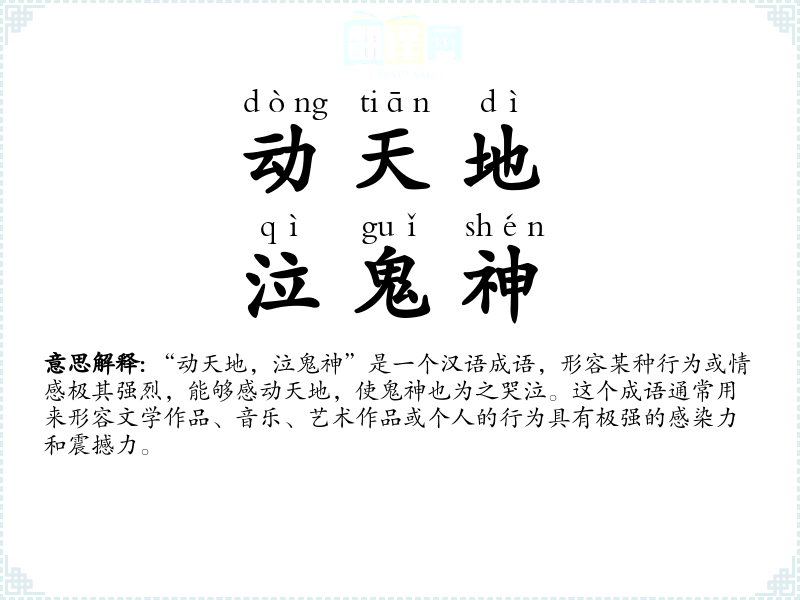 “动天地,泣鬼神”是一个汉语成语,形容某种行为或情感极其强烈,能够感动天地,使鬼神也为之哭泣。这个成语通常用来形容文学作品、音乐、艺术作品或个人的行为具有极强的感染力和震撼力。