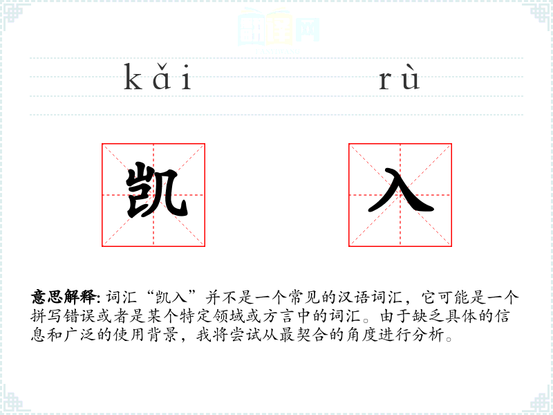 由于“凯入”不是一个标准词汇,我们无法给出确切的字面意思和基本含义。如果这是一个特定领域的术语,它可能具有特定的含义,但这需要具体的上下文来确定。