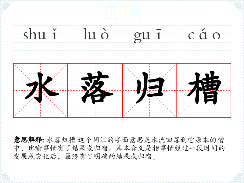 在文化中,水落归槽** 常常与“因果报应”或“天道酬勤”等观念相联系,强调事情最终会有一个公正的结果。在社会背景中,这个词也反映了人们对事情有明确结果的渴望和期待。
