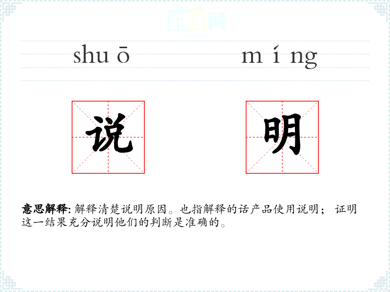 解释清楚说明原因。也指解释的话产品使用说明; 证明这一结果充分说明他们的判断是准确的。