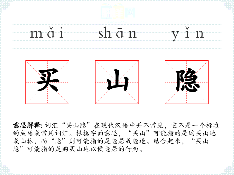 词汇“买山隐”在现代汉语中并不常见,它不是一个标准的成语或常用词汇。根据字面意思,“买山”可能指的是购买山地或山林,而“隐”则可能指的是隐居或隐退。结合起来,“买山隐”可能指的是购买山地以便隐居的行为。