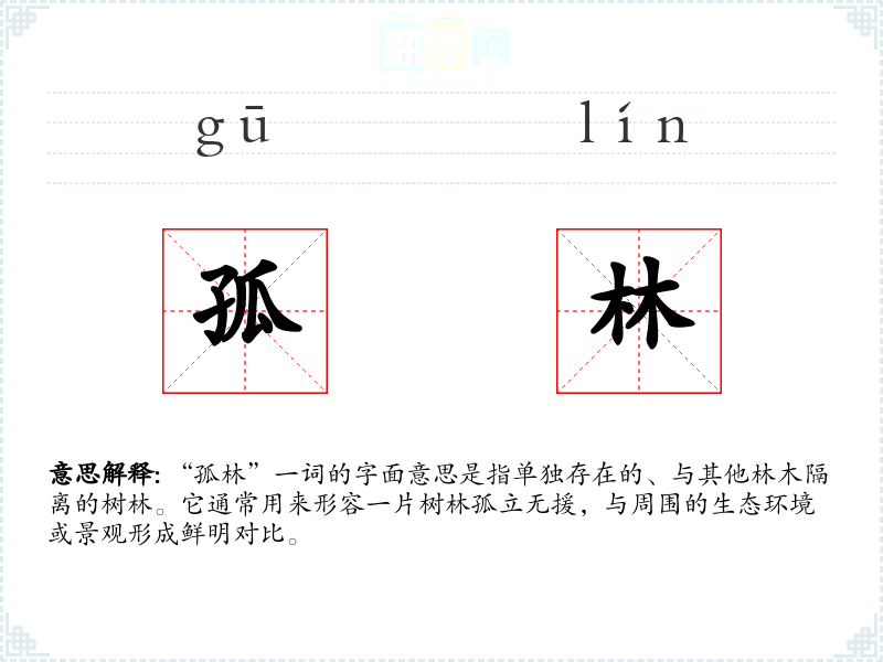 “孤林”一词的字面意思是指单独存在的、与其他林木隔离的树林。它通常用来形容一片树林孤立无援,与周围的生态环境或景观形成鲜明对比。