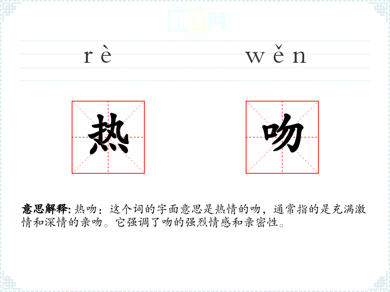 热吻:这个词的字面意思是热情的吻,通常指的是充满激情和深情的亲吻。它强调了吻的强烈情感和亲密性。
