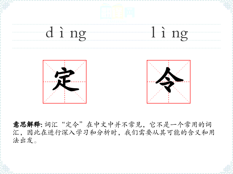 词汇“定令”在中文中并不常见,它不是一个常用的词汇,因此在进行深入学*和分析时,我们需要从其可能的含义和用法出发。