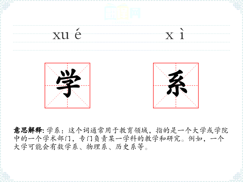 学系:这个词通常用于教育领域,指的是一个大学或学院中的一个学术部门,专门负责某一学科的教学和研究。例如,一个大学可能会有数学系、物理系、历史系等。