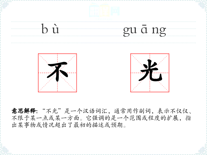 “不光”由“不”和“光”组成,其中“不”表示否定,“光”原意为光亮或仅限于某一点。随着语言的发展,“不光”逐渐演变为表示超出单一范围的含义。