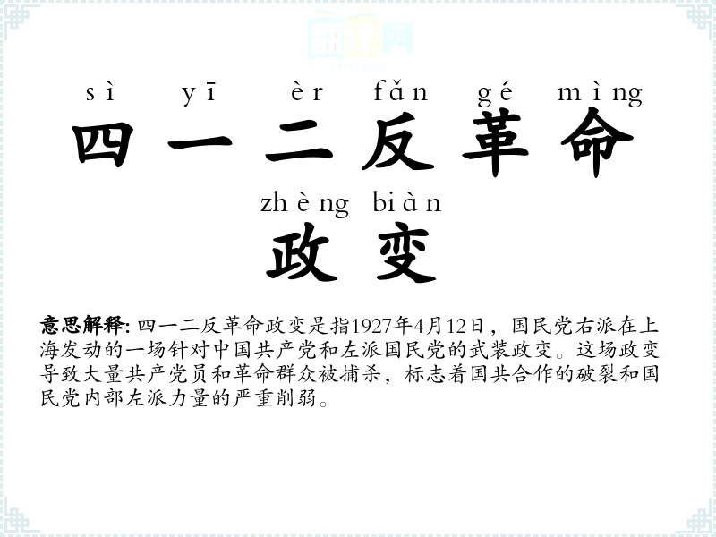四一二反革命政变是一个深刻影响历史进程的,它不仅是一个历史术语,也是一个政治和文化的符号。通过对这一词汇的学和分析,可以更好地理解历史的复杂性和政治的多变性。在语言学和表达中,这一词汇的重要性在于它能够帮助我们更准确地理解和描述历史**,同时也能够激发我们对历史和政治的深入思考。