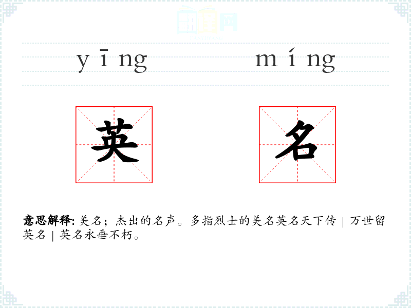 美名;杰出的名声。多指烈士的美名英名天下传|万世留英名|英名