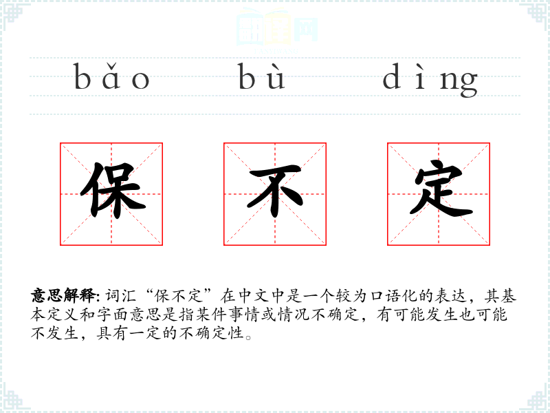 词汇“保不定”在中文中是一个较为口语化的表达,其基本定义和字面意思是指某件事情或情况不确定,有可能发生也可能不发生,具有一定的不确定性。