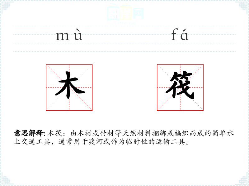 - 反义词:轮船、快艇、飞机(这些是现代化的交通工具,与木筏形成对比)