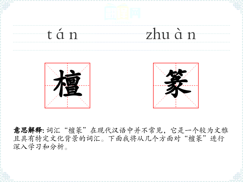 词汇“檀篆”在现代汉语中并不常见,它是一个较为文雅且具有特定文化背景的词汇。下面我将从几个方面对“檀篆”进行深入学*和分析。