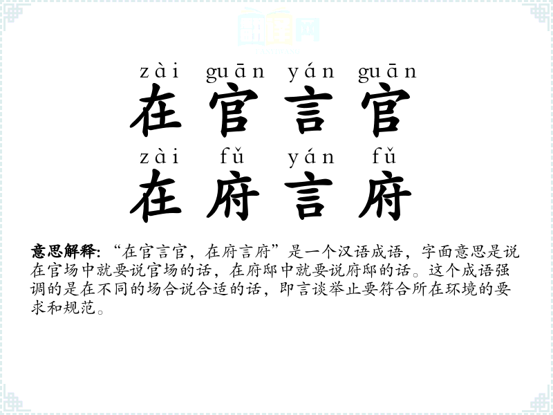 “在官言官,在府言府”是一个汉语成语,字面意思是说在官场中就要说官场的话,在府邸中就要说府邸的话。这个成语强调的是在不同的场合说合适的话,即言谈举止要符合所在环境的要求和规范。