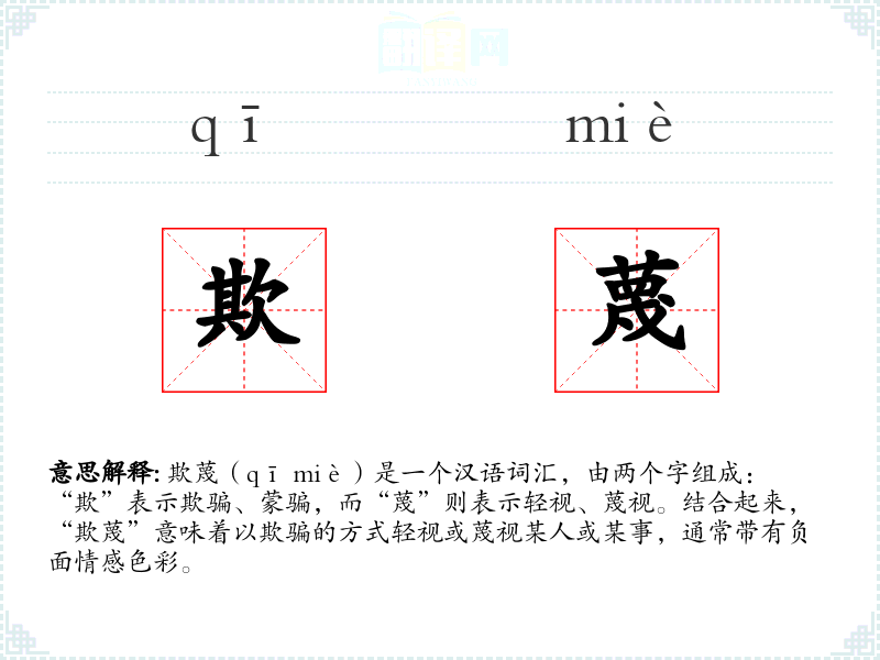 欺蔑(qī miè)是一个汉语词汇,由两个字组成:“欺”表示欺骗、蒙骗,而“蔑”则表示轻视、蔑视。结合起来,“欺蔑”意味着以欺骗的方式轻视或蔑视某人或某事,通常带有负面情感色彩。
