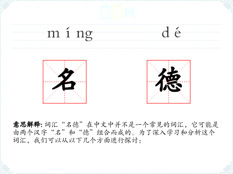 词汇“名德”在中文中并不是一个常见的词汇,它可能是由两个汉字“名”和“德”组合而成的。为了深入学*和分析这个词汇,我们可以从以下几个方面进行探讨: