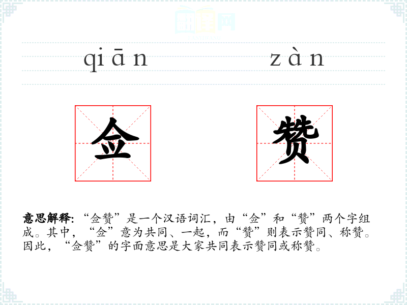 “佥赞”是一个汉语词汇,由“佥”和“赞”两个字组成。其中,“佥”意为共同、一起,而“赞”则表示赞同、称赞。因此,“佥赞”的字面意思是大家共同表示赞同或称赞。