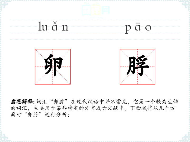 词汇“卵脬”在现代汉语中并不常见,它是一个较为生僻的词汇,主要用于某些特定的方言或古文献中。下面我将从几个方面对“卵脬”进行分析: