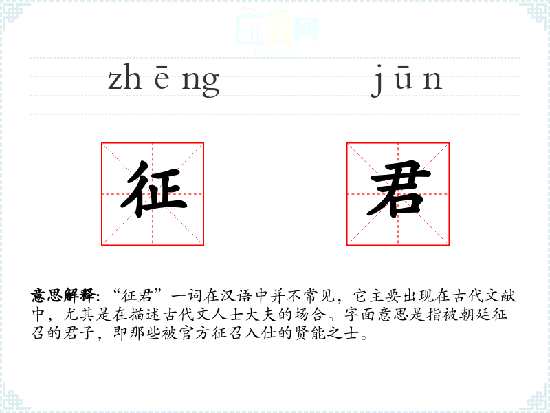 “征君”一词在汉语中并不常见,它主要出现在古代文献中,尤其是在描述古代文人士大夫的场合。字面意思是指被朝廷征召的君子,即那些被官方征召入仕的贤能之士。
