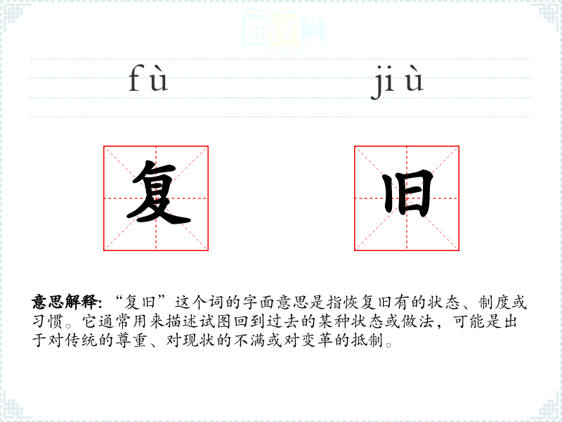 “复旧”这个词源于汉语,由“复”和“旧”两个字组成。在古代汉语中,“复”有恢复、重复的意思,“旧”则指过去的时间或状态。随着时间的推移,“复旧”逐渐被用来描述各种试图回到过去的行为或政策。