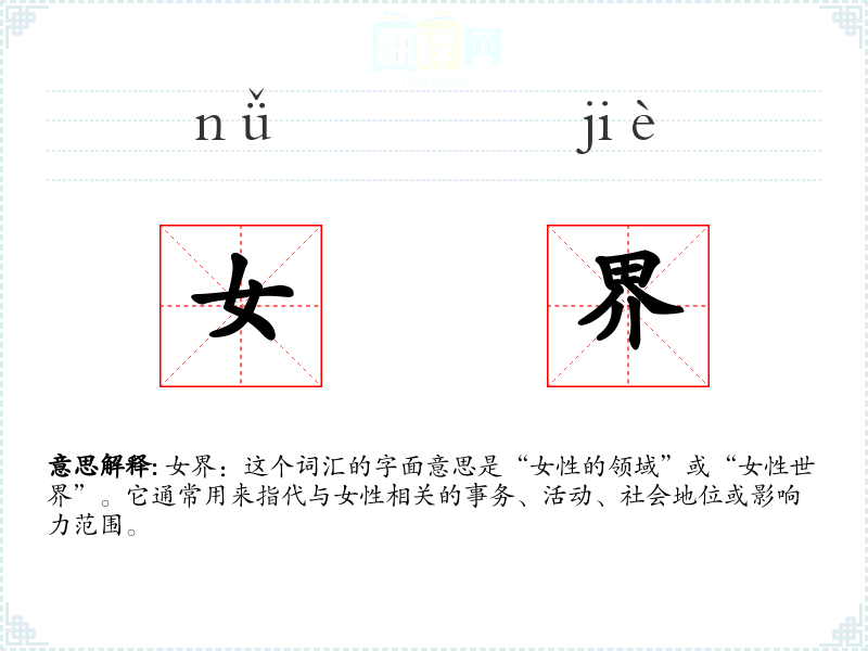 女界:这个词汇的字面意思是“女性的领域”或“女性世界”。它通常用来指代与女性相关的事务、活动、社会地位或影响力范围。