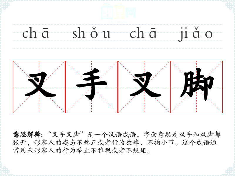 “叉手叉脚”是一个汉语成语,字面意思是双手和双脚都张开,形容人的姿态不端正或者行为放肆、不拘小节。这个成语通常用来形容人的行为举止不雅观或者不规矩。
