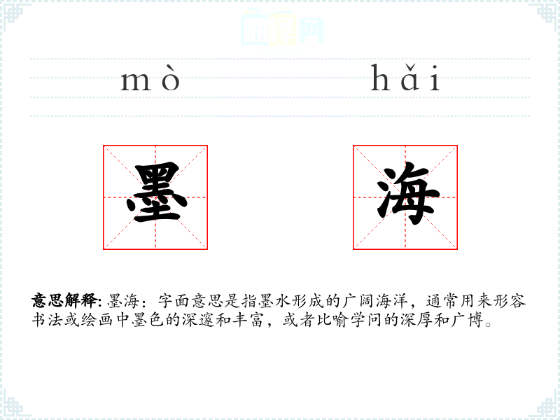 墨海:字面意思是指墨水形成的广阔海洋,通常用来形容书法或绘画中墨色的深邃和丰富,或者比喻学问的深厚和广博。