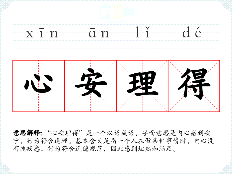“心安理得”是一个汉语成语,字面意思是内心感到安宁,行为符合道理。基本含义是指一个人在做某件事情时,内心没有愧疚感,行为符合道德规范,因此感到坦然和满足。