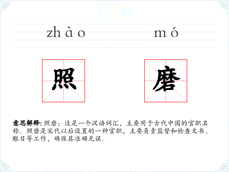 词源:照磨一词源自古代汉语,“照”意为照看、监督,“磨”可能源自“磨勘”,即仔细检查。 演变:随着时间的推移,照磨这一官职在明清时期逐渐消失,但其职能被其他官职所继承。