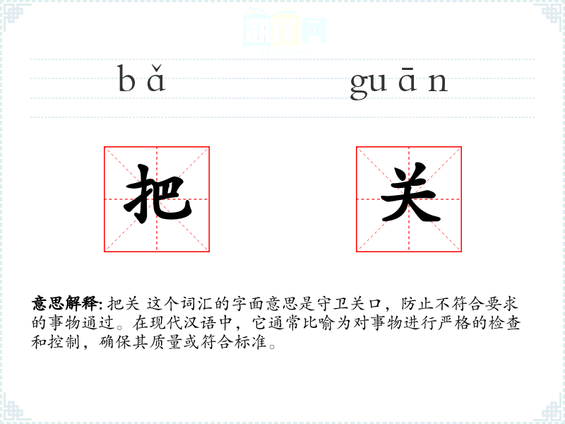 把关 这个词汇的字面意思是守卫关口,防止不符合要求的事物通过。在现代汉语中,它通常比喻为对事物进行严格的检查和控制,确保其质量或符合标准。