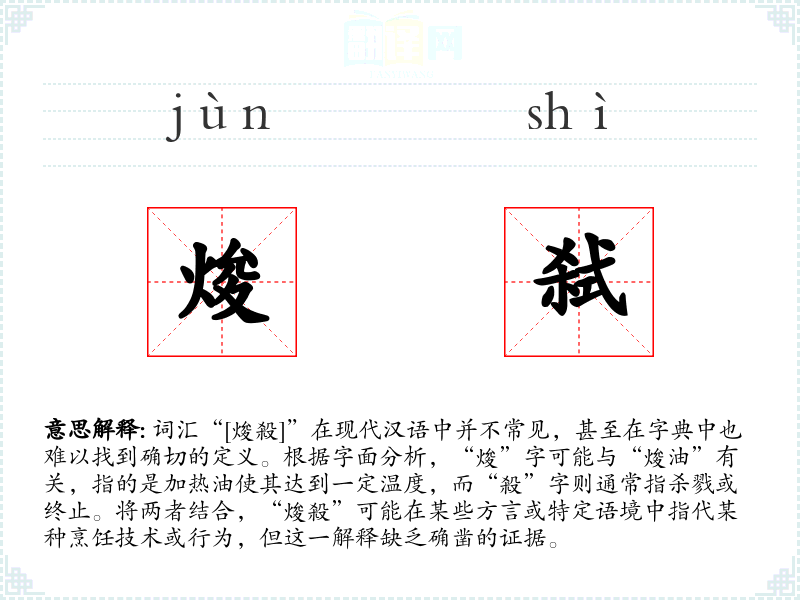“焌”字在古代文献中有时指加热油,而“殺”字则有杀戮、终止的意思。两者的结合可能源自某种特定的烹饪技术或行为,但其具体含义和用法在历史文献中缺乏详细记录。