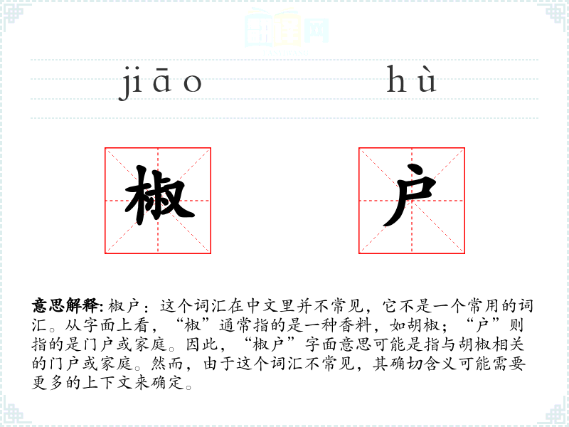 椒户:这个词汇在中文里并不常见,它不是一个常用的词汇。从字面上看,“椒”通常指的是一种香料,如胡椒;“户”则指的是门户或家庭。因此,“椒户”字面意思可能是指与胡椒相关的门户或家庭。然而,由于这个词汇不常见,其确切含义可能需要更多的上下文来确定。