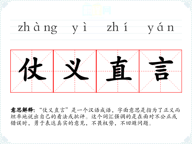“仗义直言”是一个汉语成语,字面意思是指为了正义而坦率地说出自己的看法或批评。这个词汇强调的是在面对不公正或错误时,勇于表达真实的意见,不畏权势,不回避问题。