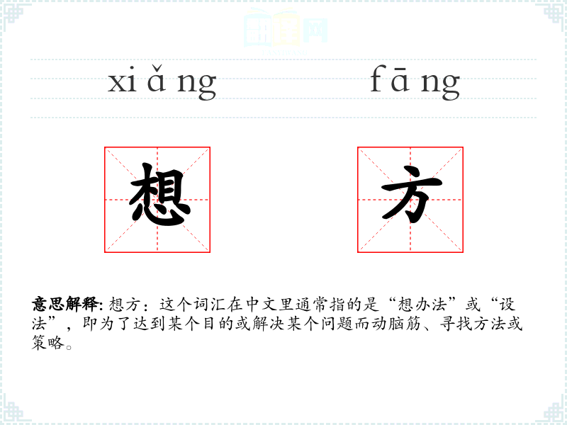 想方:这个词汇在中文里通常指的是“想办法”或“设法”,即为了达到某个目的或解决某个问题而动脑筋、寻找方法或策略。