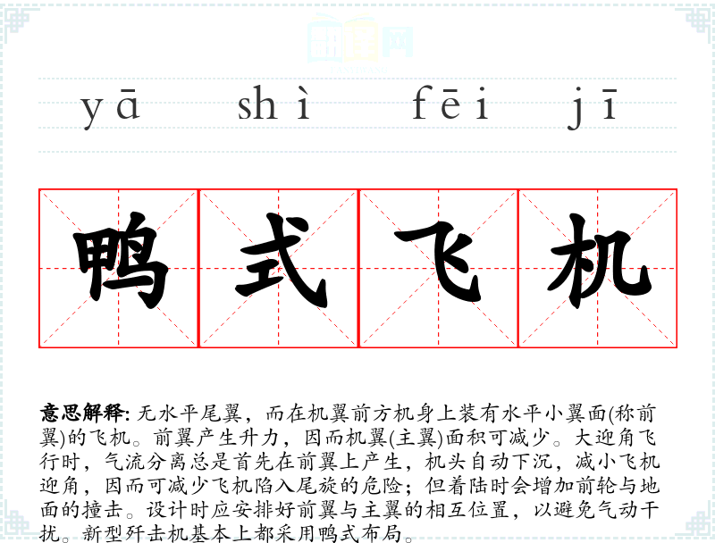 1.无水平尾翼,而在机翼前方机身上装有水平小翼面(称前翼)的飞机。前翼产生升力,因而机翼(主翼)面积可减少。大迎角飞行时,气流分离总是首先在前翼上产生,机头自动下沉,减小飞机迎角,因而可减少飞机陷入尾旋的危险;但着陆时会增加前轮与地面的撞击。设计时应安排好前翼与主翼的相互位置,以避免气动干扰。新型歼击机基本上都采用鸭式布局。