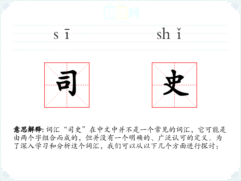 由于“司史”不是一个标准词汇,我们无法给出一个确切的基本定义。但从字面上理解,“司”通常有管理、负责的意思,“史”则指历史或记录历史的官员。因此,“司史”可能指的是负责管理或记录历史的人或机构。