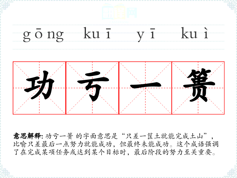 功亏一篑 的字面意思是“只差一筐土就能完成土山”,比喻只差最后一点努力就能成功,但最终未能成功。这个成语强调了在完成某项任务或达到某个目标时,最后阶段的努力至关重要。