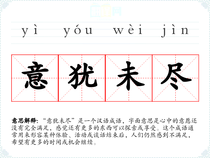 “意犹未尽”是一个汉语成语,字面意思是心中的意愿还没有完全满足,感觉还有更多的东西可以探索或享受。这个成语通常用来形容某种体验、活动或谈话结束后,人们仍然感到不满足,希望有更多的时间或机会继续。